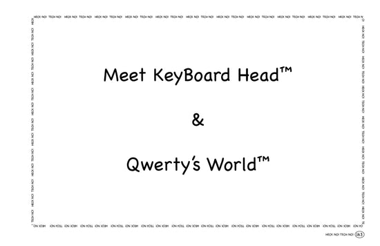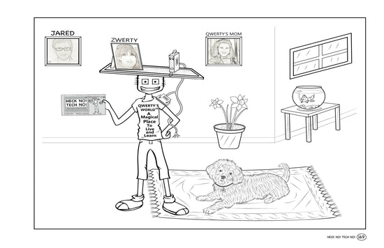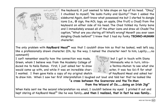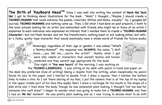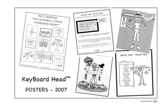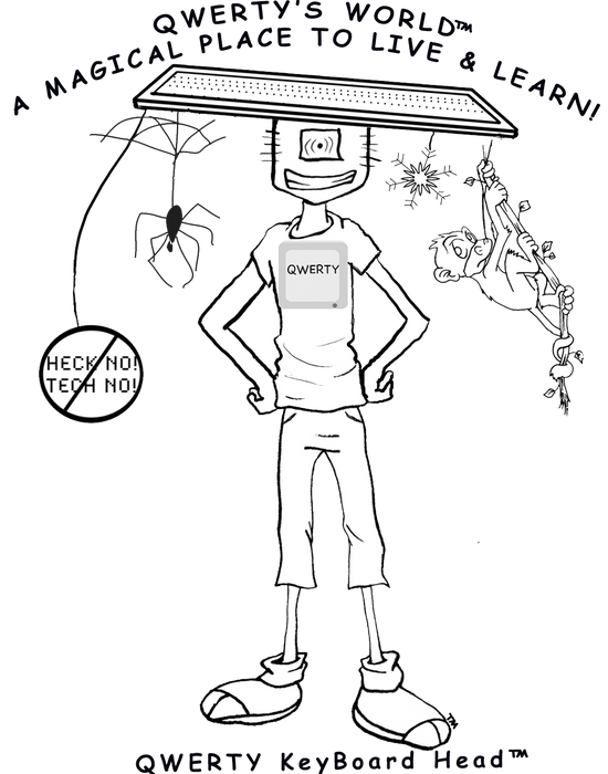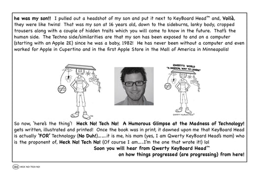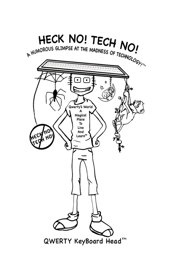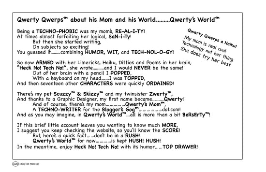 The eight pages below explain the journey of how QWERTY’S WORLD™ began! (There is also a extra page showing some of the Posters I created!) I was writing a book about TECHNO-HUMOR and had a desire to create a TECHNO-HUMAN character to provide illustrations for the Limericks in this, my first book, HECK NO! TECH NO! A Humorous Glimpse at the Madness of Technology! Once it was discovered that Qwerty was my son, hence making me, Qwerty’s Mom, I started to develop more characters, including pets!