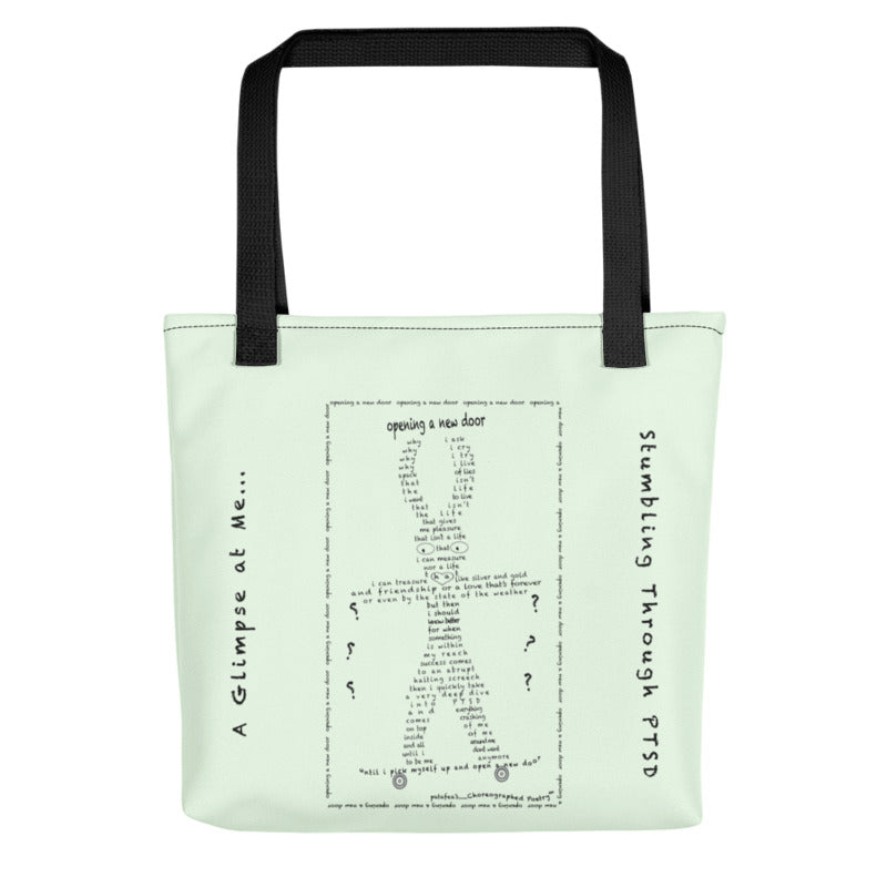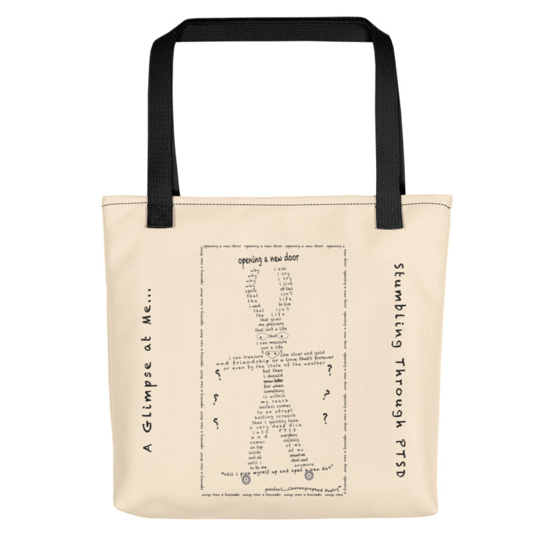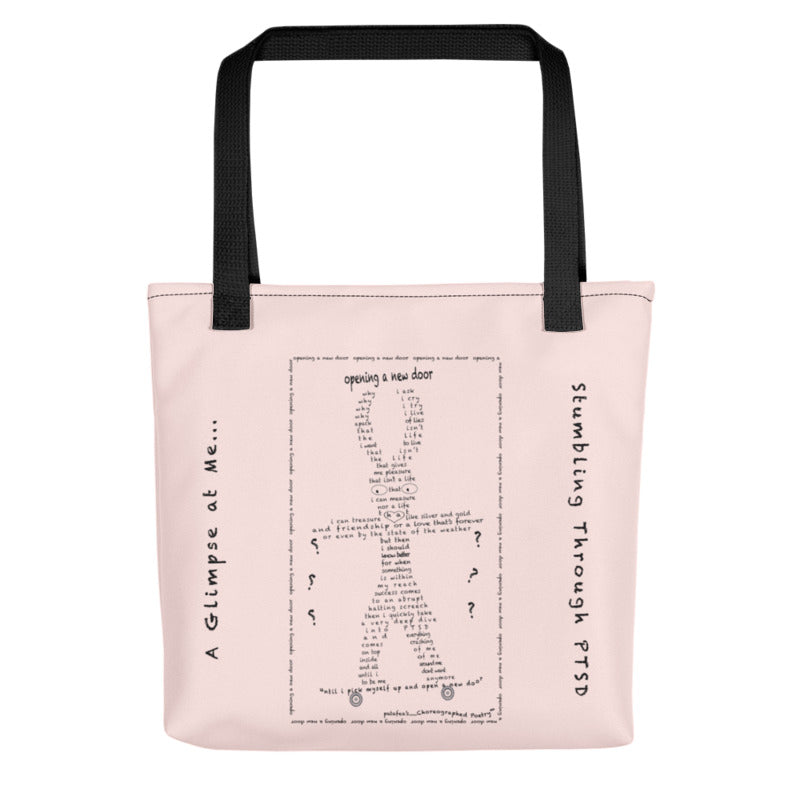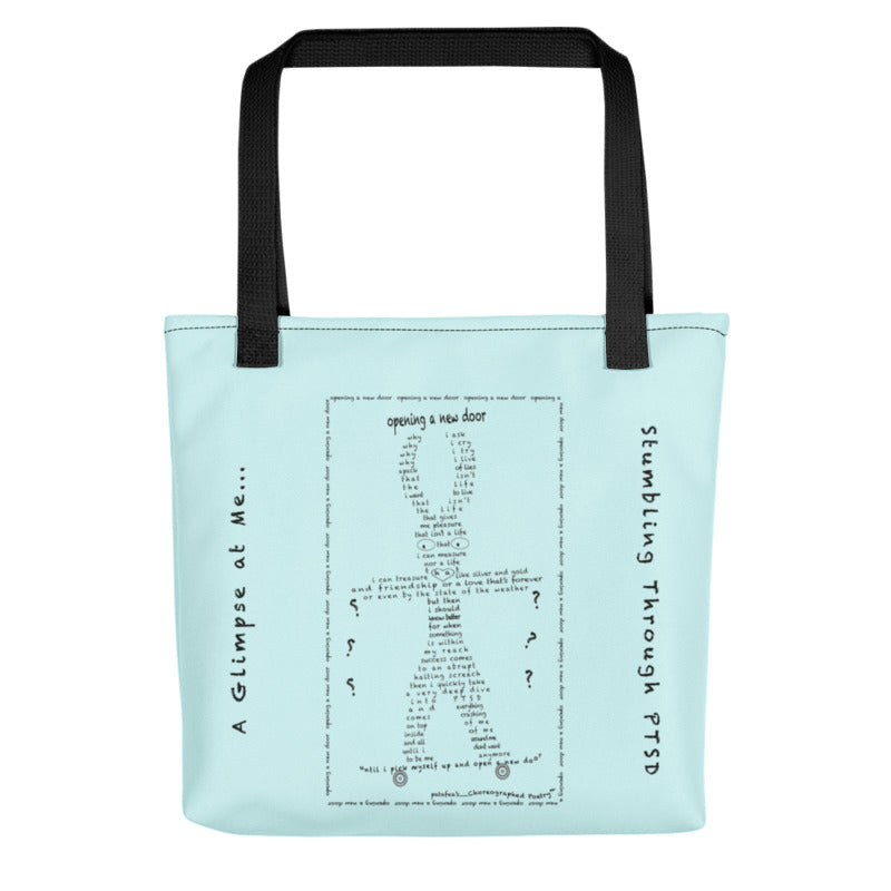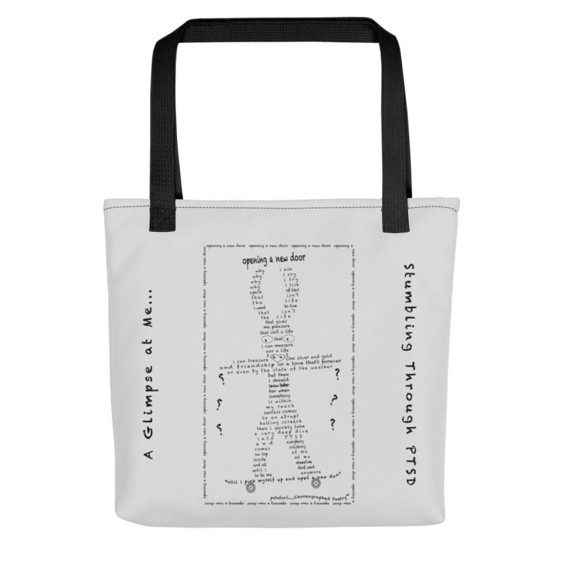 Design Description - The images and text on both sides of this BōtōBag™ (BookTote Bag) are from my book, A Glimpse at Me...Stumbling Through PTSD. One side reflects an image of someone with Mental Illness (PTSD, Depression, Anxiety, etc.) with words of encouragement and being kind to yourself on the outside of the image. On the reverse side of this series will be one of my, Choreographed Poetry™* poems; there are two styles available now, 'opening a new door' and 'Two Different Hearts'.