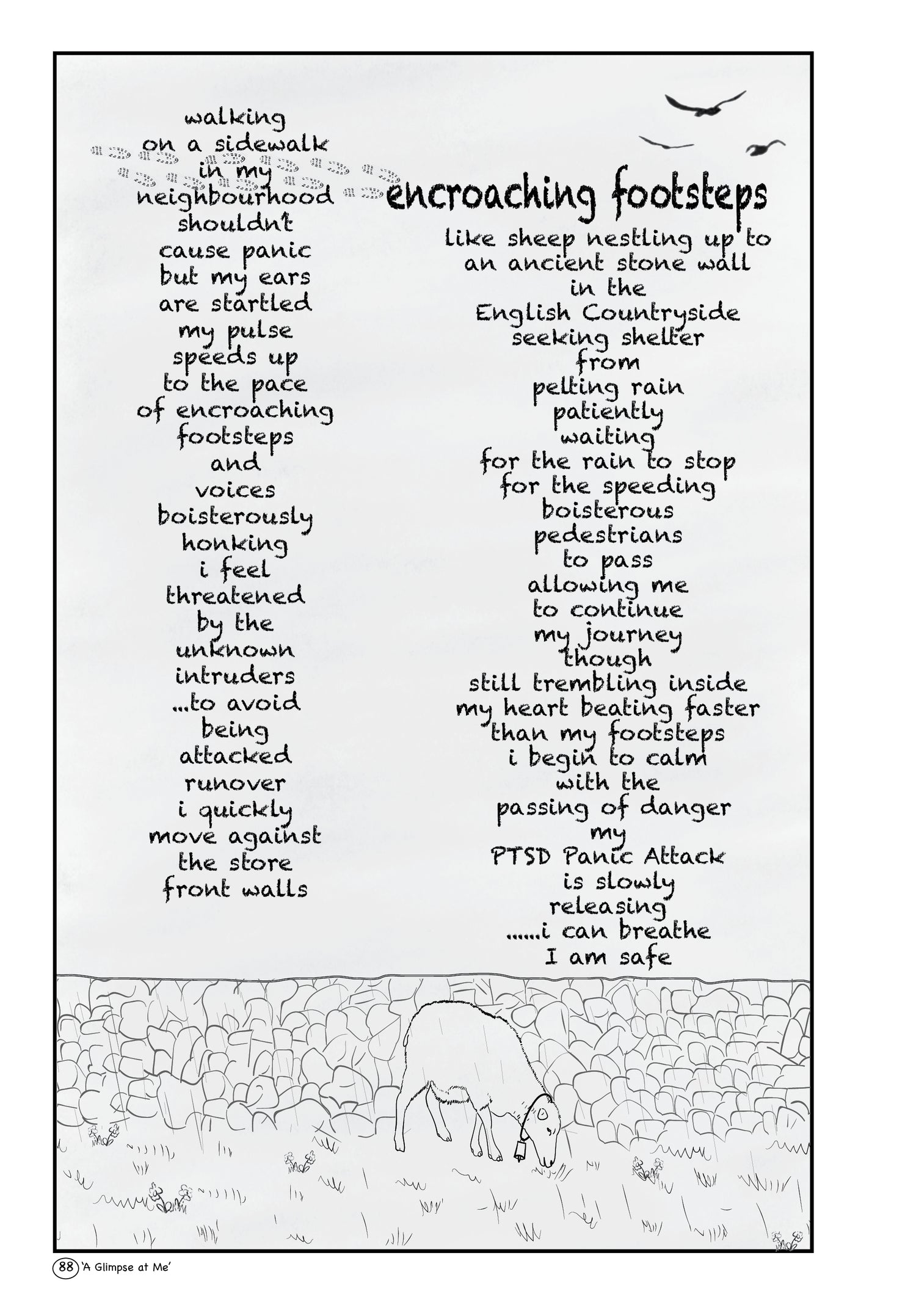 ABOUT THIS BOOK: A Glimpse at Me...Stumbling Through PTSD allows the reader to understand what it is like to live with PTSD from the inside out, through the poetic expression in both words and images from someone who lives with PTSD, brought on by various traumas in my lifetime. If you think you are picking up a ‘typical’ book of Poetry......I invite you to please wander in and take a closer look! You will find, surprisingly, this poetry is like, ‘little vignettes of prose’ written in ‘free verse’. Many of the poems are accompanied by illustrations (Scarlett Wilkins & Bzai), which have been superbly interpreted from my primitive ‘Conceptual Sketches’. To further bring out the imagery in some of the poems, I have artistically orchestrated them into what I call, Choreographed Poetry™ whose words dance onto the BLANK Pages of their theatrical stages!