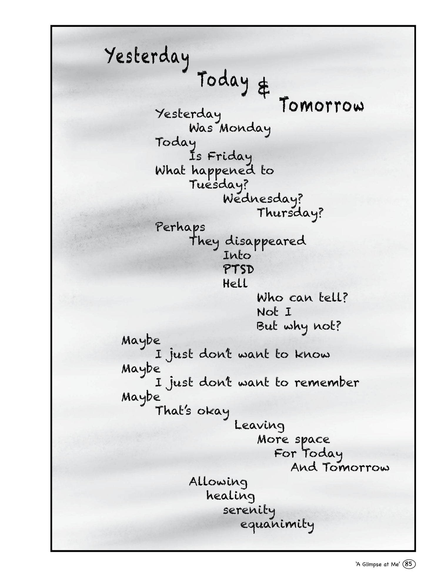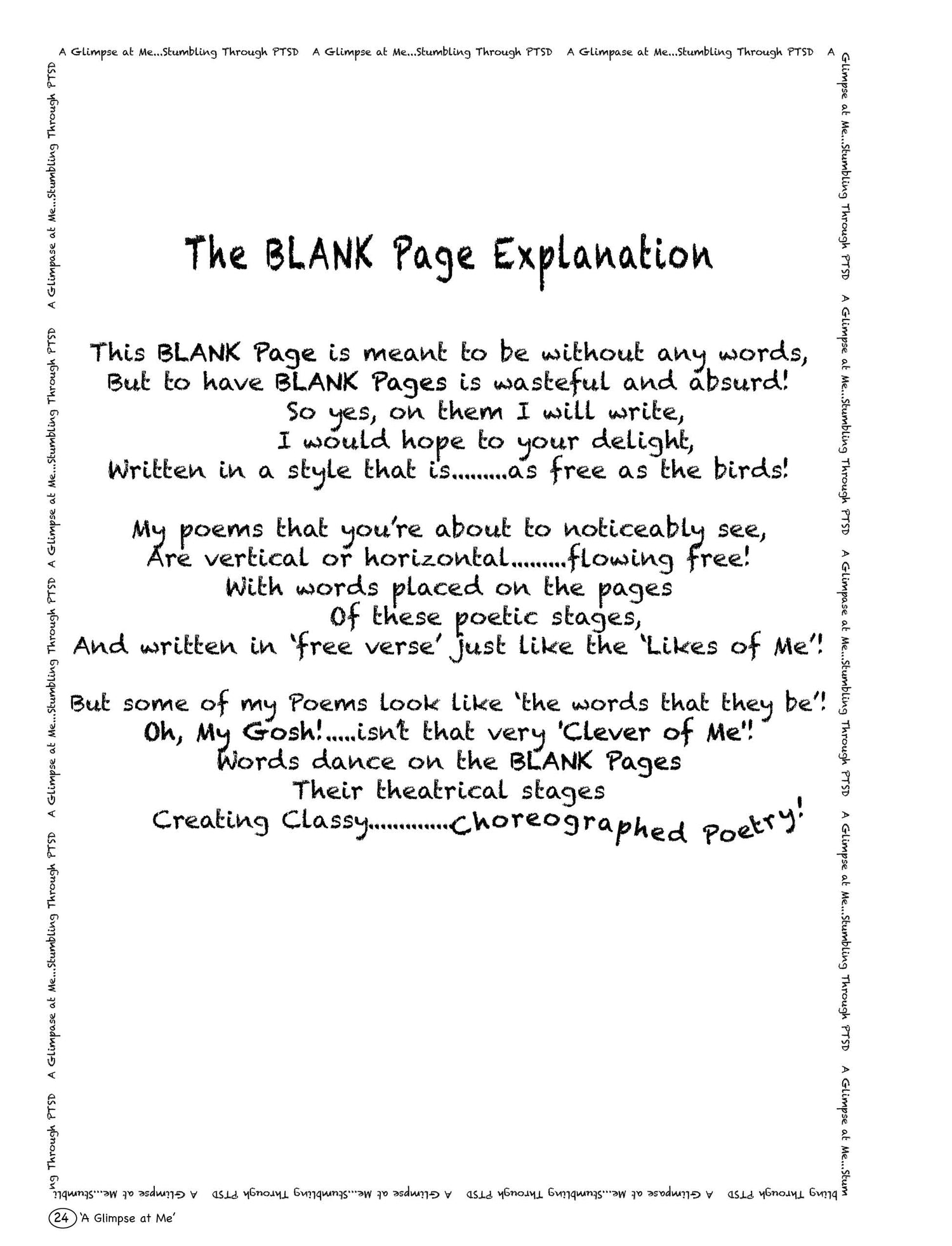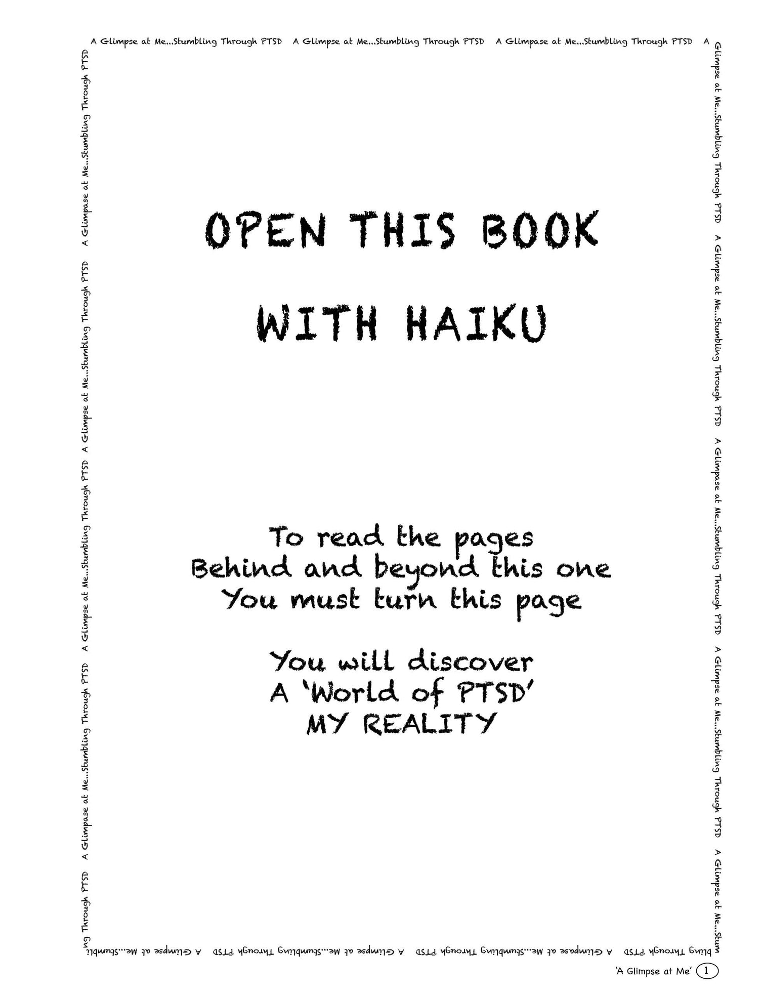If you purchased, A GLIMPSE AT ME...STUMBLING THROUGH PTSD in Hardback or any e-Book Versions, you can Download these 3 pages to have physical pages to write on, using them to submit your Poem(s), Limericks, Haiku, FreeVerse, Prose, etc., for the Blog Page in PDF, JPEG, Word, etc.