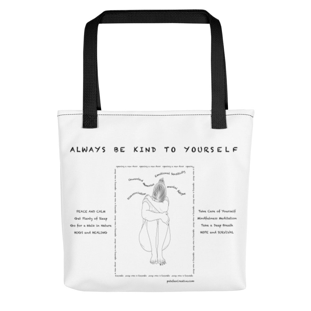 Design Description - The images and text on both sides of this BōtōBag™ (BookTote Bag) are from my book, A Glimpse at Me...Stumbling Through PTSD. One side reflects an image of someone with Mental Illness (PTSD, Depression, Anxiety, etc.) with words of encouragement and being kind to yourself on the outside of the image. On the reverse side of this series will be one of my, Choreographed Poetry™* poems; there are two styles available now, 'opening a new door' and 'Two Different Hearts'.