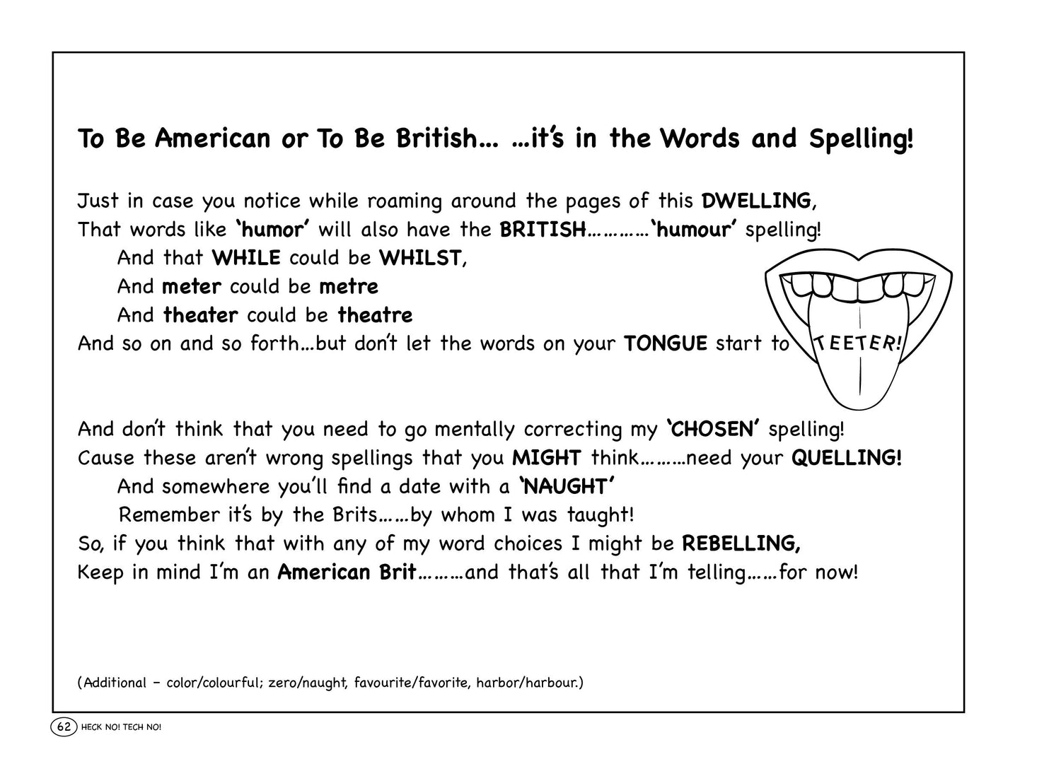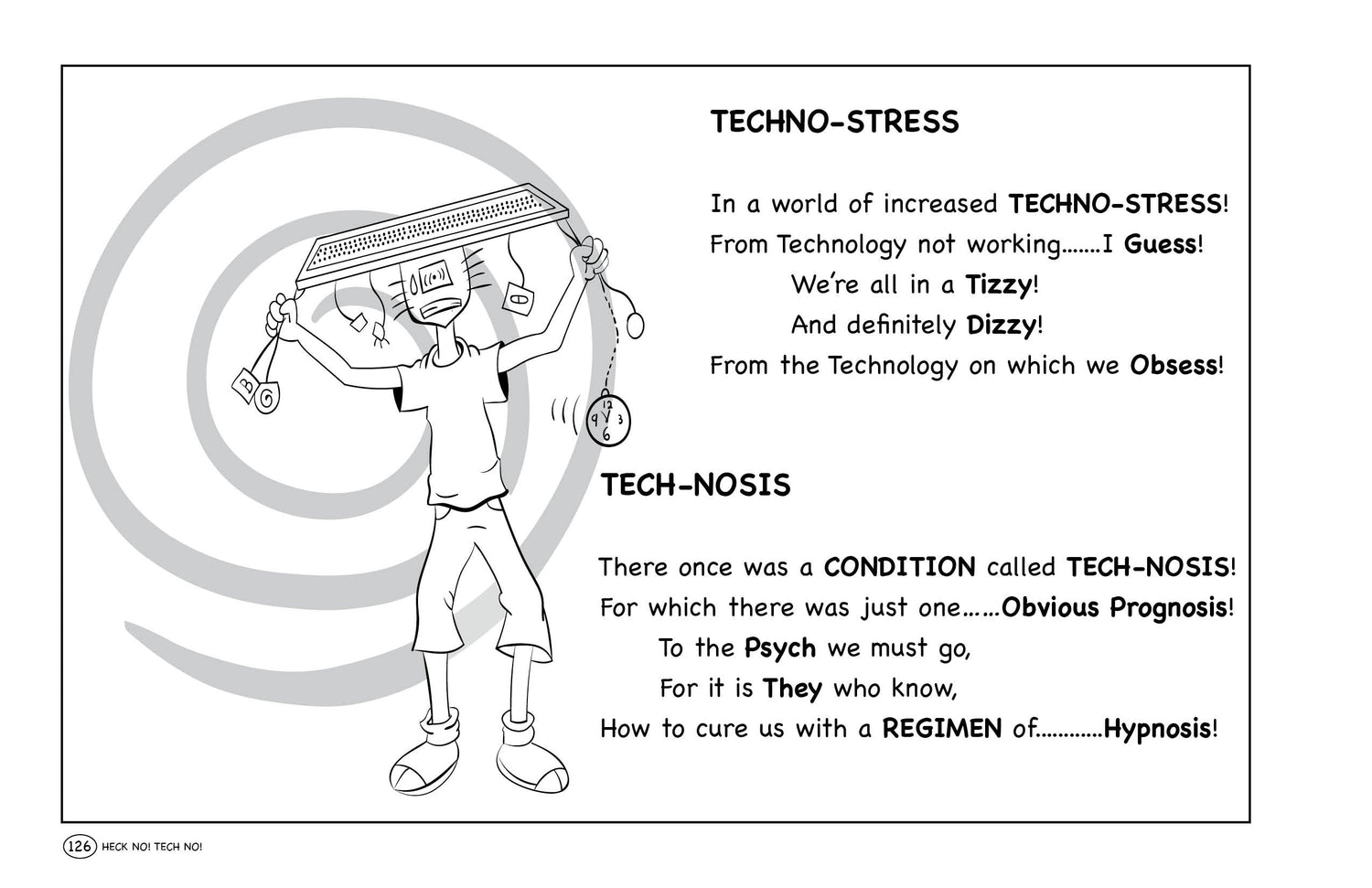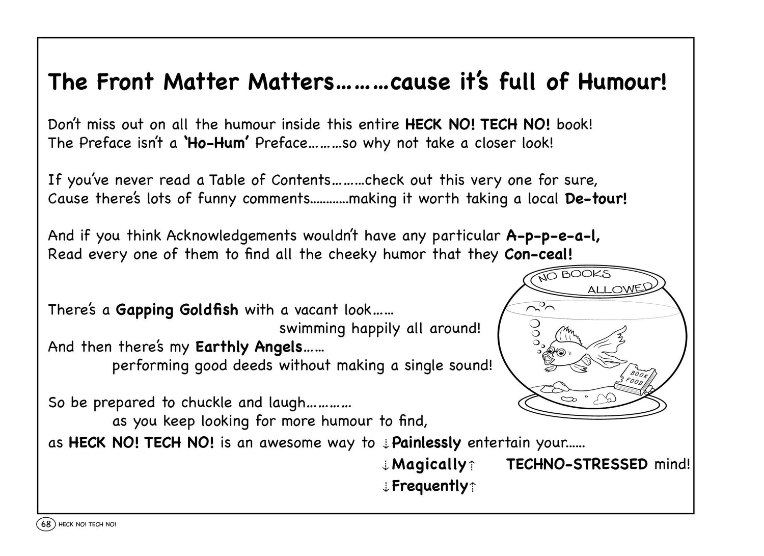 ABOUT THE BOOK - If you've ever made one TECH-SUPPORT call, had to stressfully wade through the countless prompts when calling any business, tried to figure out the multitude of 'error messages' on your PC or dodged the 'spinning rainbow pinwheel' on a Mac, or are fearful of losing all your files.....consider yourself to be in TECHNO-STRESS, have TECHNO-DREAD or perhaps see yourself as being a TECHNO-GYPSY or having TECHNO-PERPLEXITY.....you will most certainly relate to and be entertained by the humorous Poems, Limericks, Ditties, Haiku and the plethora of HuMorOus VisuAls in, "Heck No! Tech No!" (HNTN) that address the Madness of Technology!' You will also discover humour throughout the entire book, from the Opening Page, to the Preface, to the Acknowledgements; with hidden gems (NO, not rubies or diamonds) that are a Kaleidoscope of HUMOUR hidden in the Contents (Table of), on the BLANK Pages, served up in the Technology Menu, and more...lots more! "HECK NO! TECH NO!" will forever brighten your days with Laughter and Chuckles and give you, "A Humorous Glimpse at the Madness of Technology!" ENJOY!