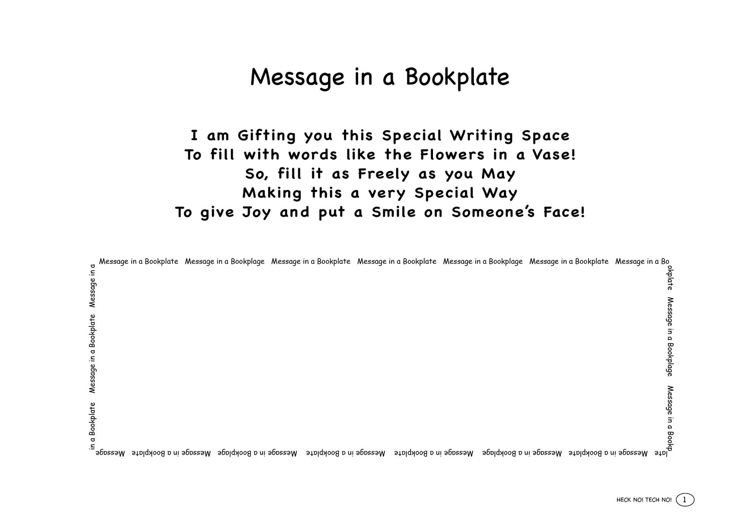 If you purchased, HECK NO! TECH NO! 2nd Ed. or any e-Book Version, you can Download these 3 pages to have physical pages to write on, using them to submit your Poem(s), Limericks, Haiku, FreeVerse, Prose, etc., for the Blog Page in PDF, JPEG, Word, etc. Any questions, please CONTACT me!P.S. These 3 pages came about when Amazon printed my Paperback books, adding 4 blank pages, using the last page for their Barcode and Location Imprint, leaving me with 3 Blank Pages! As you will see in all of my books, I don't like having any Blank Pages, and so I write on them, and include the words, 'Blank Page(s)' in the Title! Instead of adding more of my Poetry on those pages, I decided to Gift them to, you......my Poetic Sages! ENJOY!